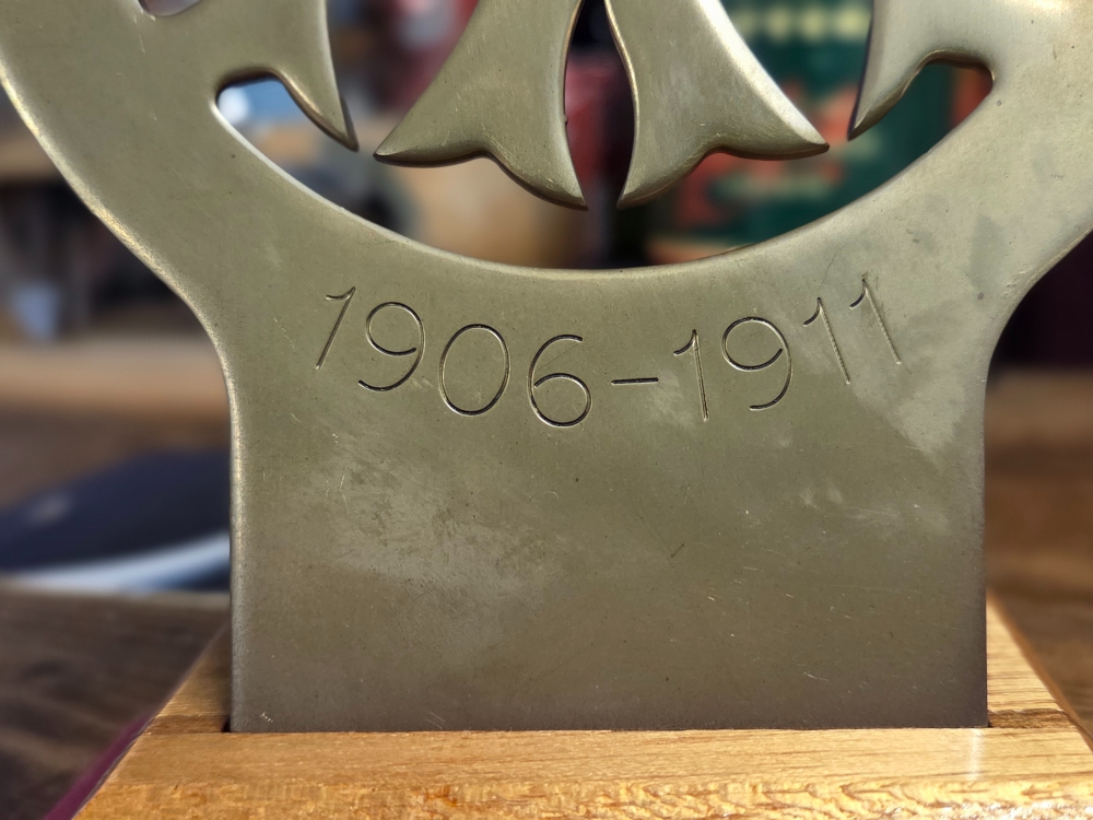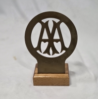 AA brass grill badge app 7 inches , mounted on wood stand , nice thing 1906 to 1911