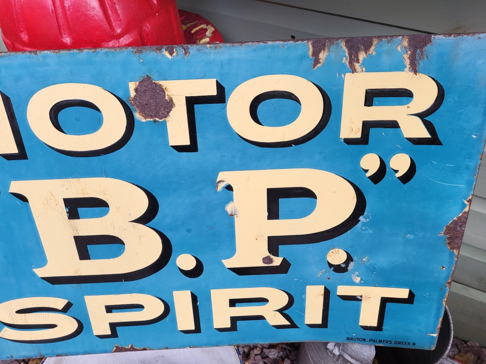 BP original double sided sign by Bruton , Palmers Green , what an absolute stunning double sided sign with side mounting flange .