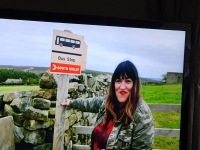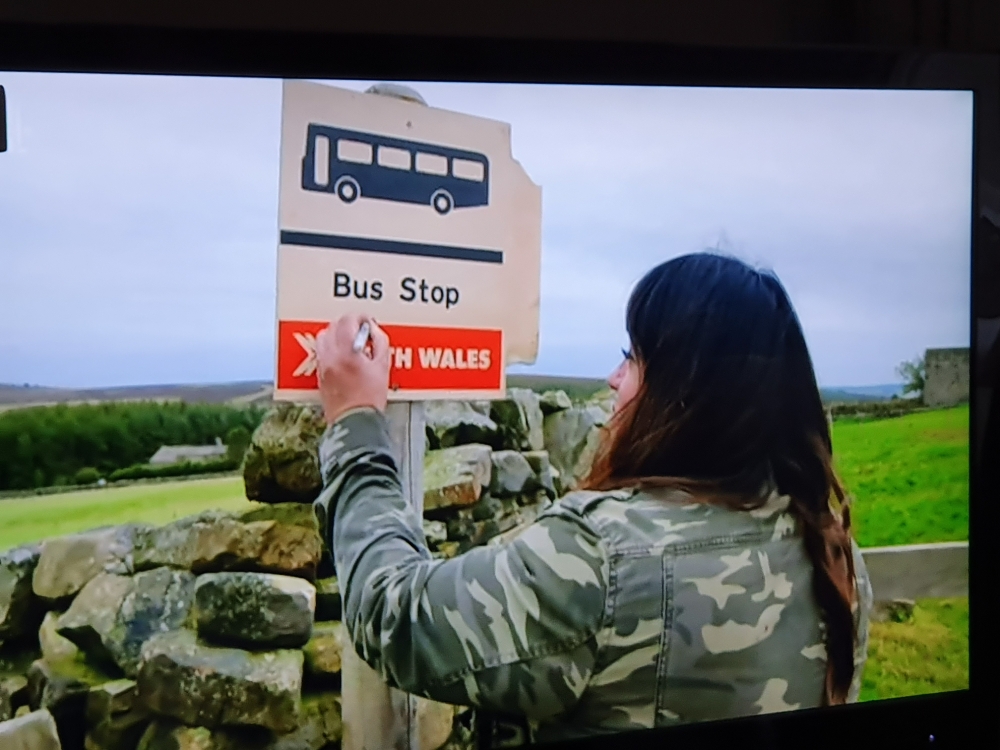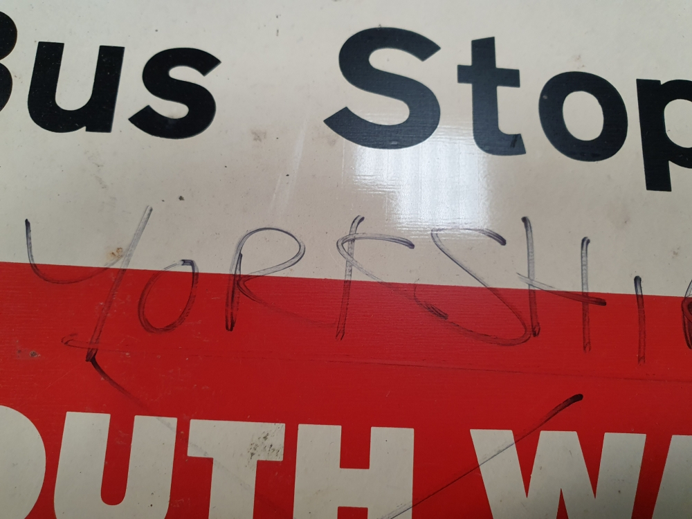 Johnny Vegas Bus stop sign as used on the hit TV show " Glamping " the series which followed Johnny on his quest to start up a glamping field in Yorkshire , this sign can be seen in the show with Bev and Johnny standing with it , it still retains the " Yorkshire " shown on the TV show being written by BevDouble sided plastic sign , slight damage to side as seen in pics from the show .App 12 x 12 inches. Great for garage or mancave.
